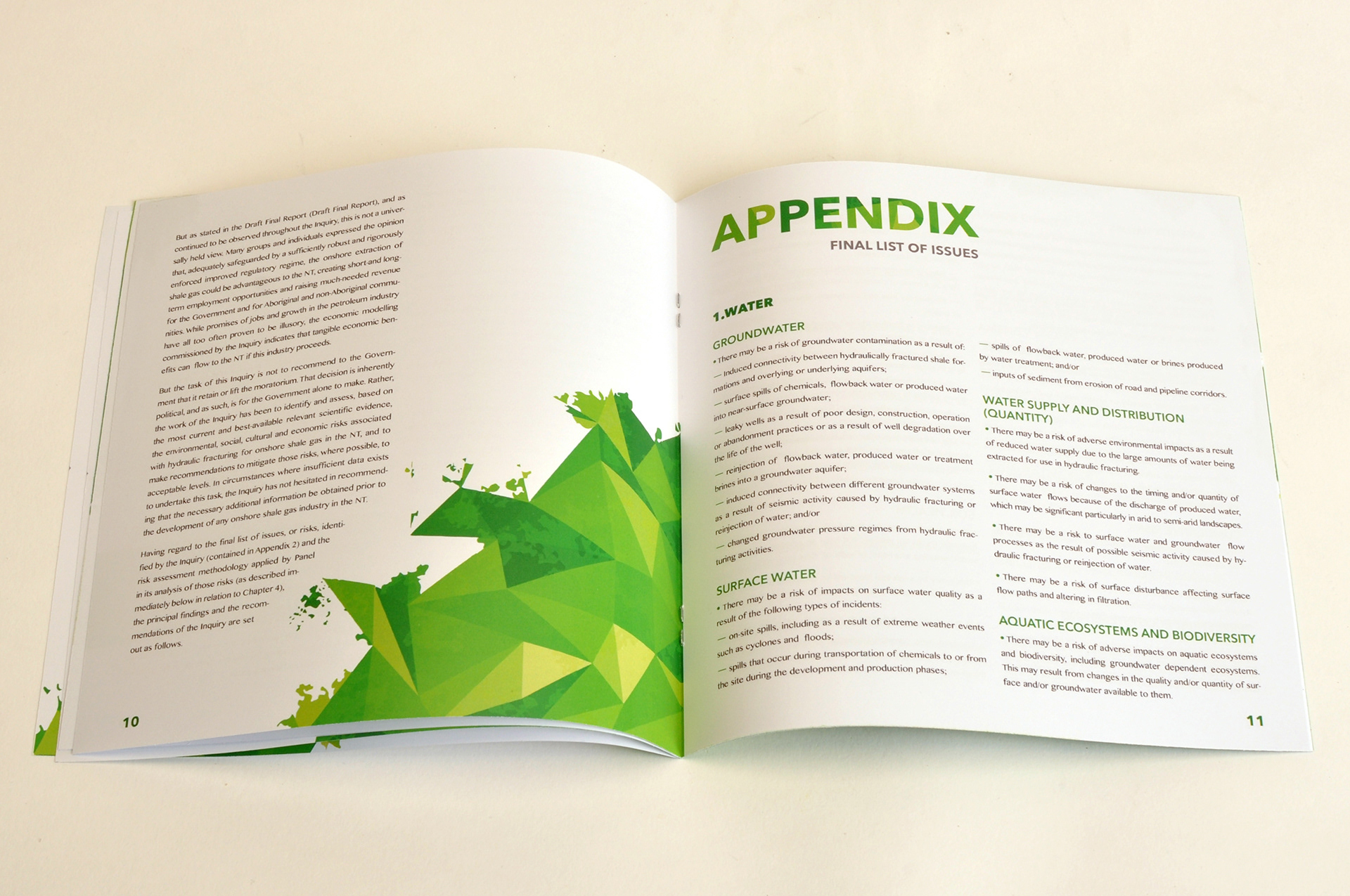 Creation of a layout for a report about Fracking in the Northern Territory. Softwares: InDesign (booklet) and Illustrator (images). Technique: Vector illustrations and Typography. Size: 210 x 210 mm.