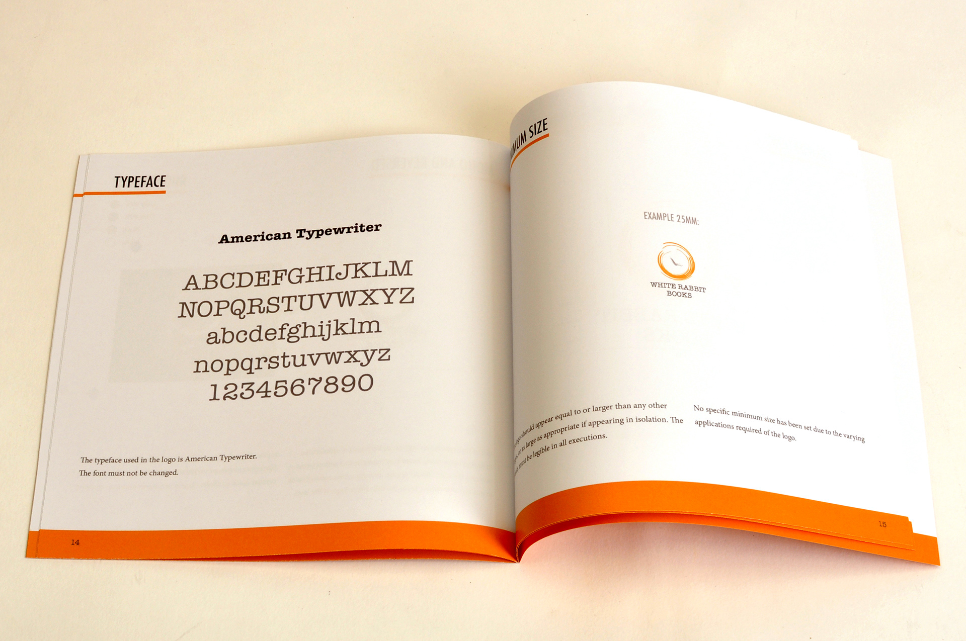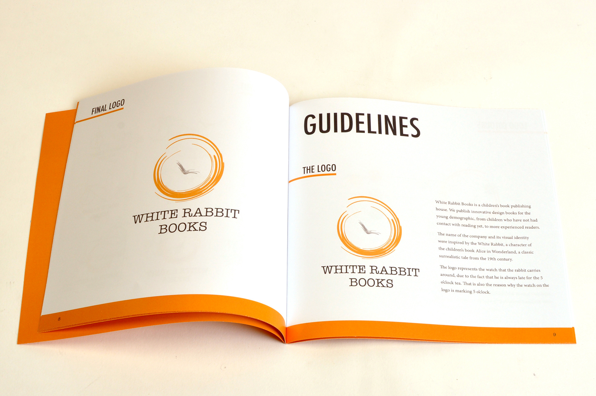 Creation of a Style Guide for the logo of White Rabbit Books Publishing House. Softwares: InDesign (booklet) and Illustrator (logo). Technique: Vector illustrations and Typography. Size: 210 x 210 mm.