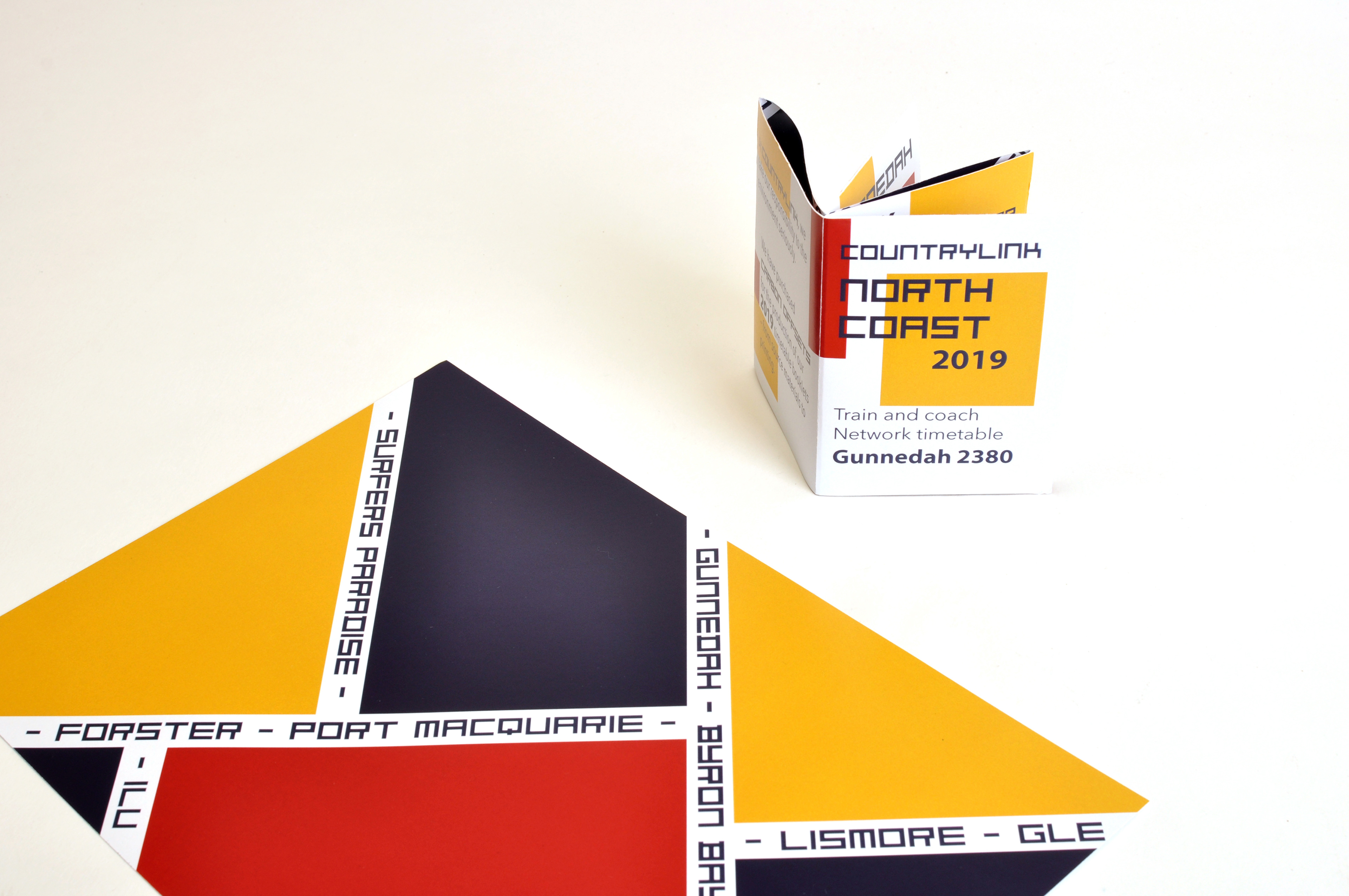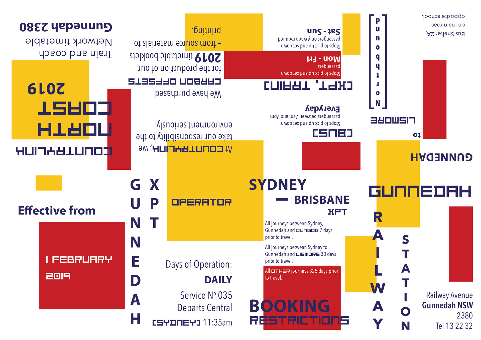 Creation of an experimental timetable for the North Coast NSW Train, based on the art movement De Stijl. Software: InDesign. Technique: Typography. Size: 74.4 x 105 mm.