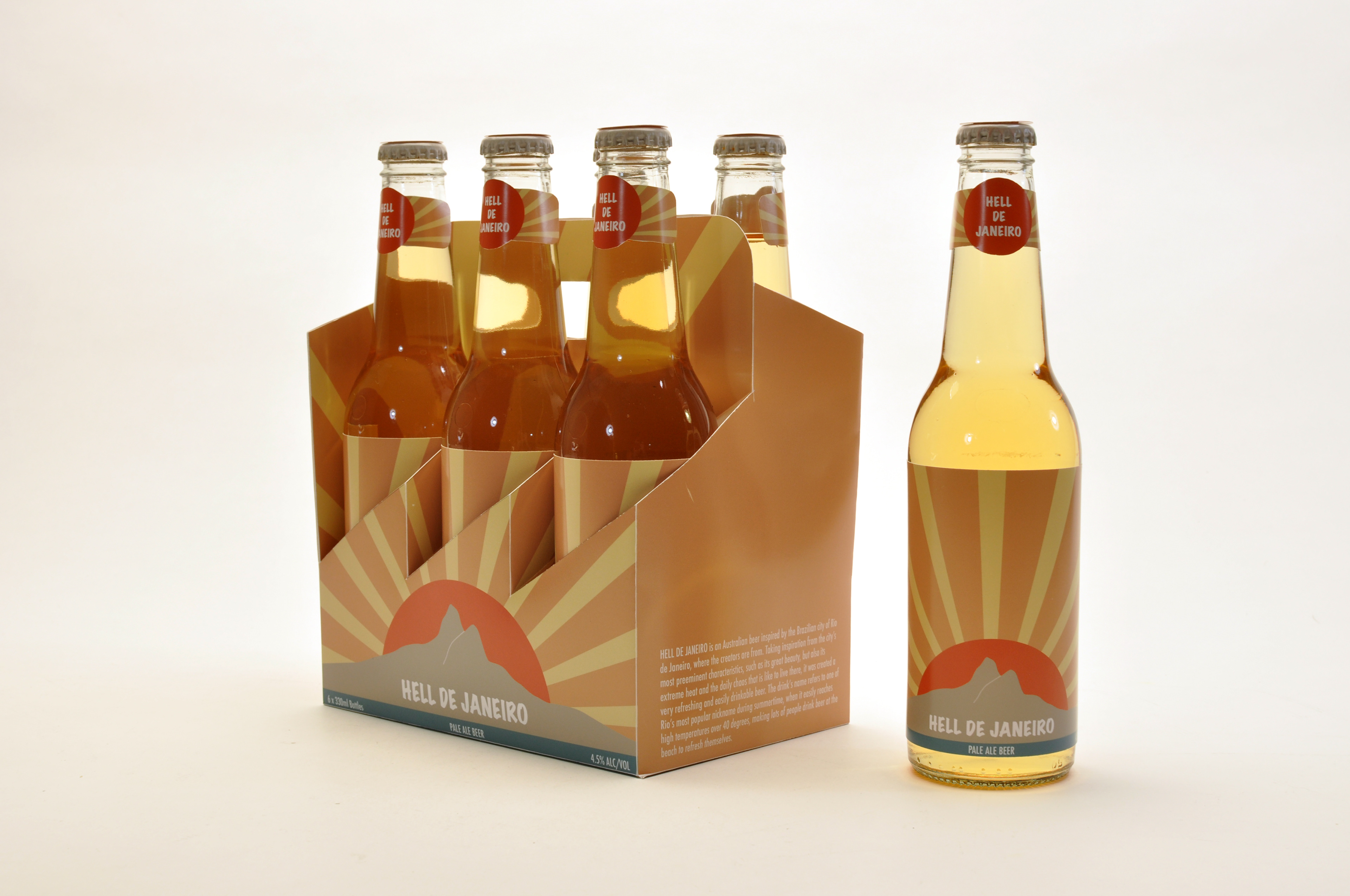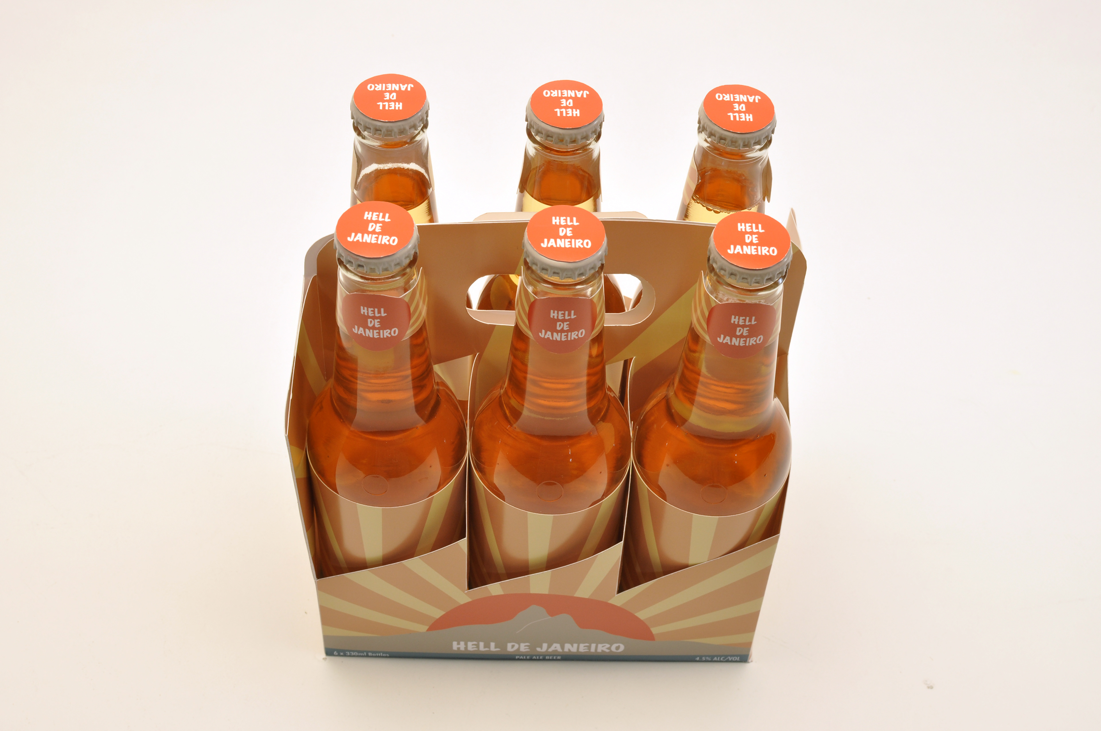 Creation of a package and labels for Hell de Janeiro Beer. Software: Illustrator. Technique: Vector illustrations and Typography. Size: 200 x 180 x 120 mm.