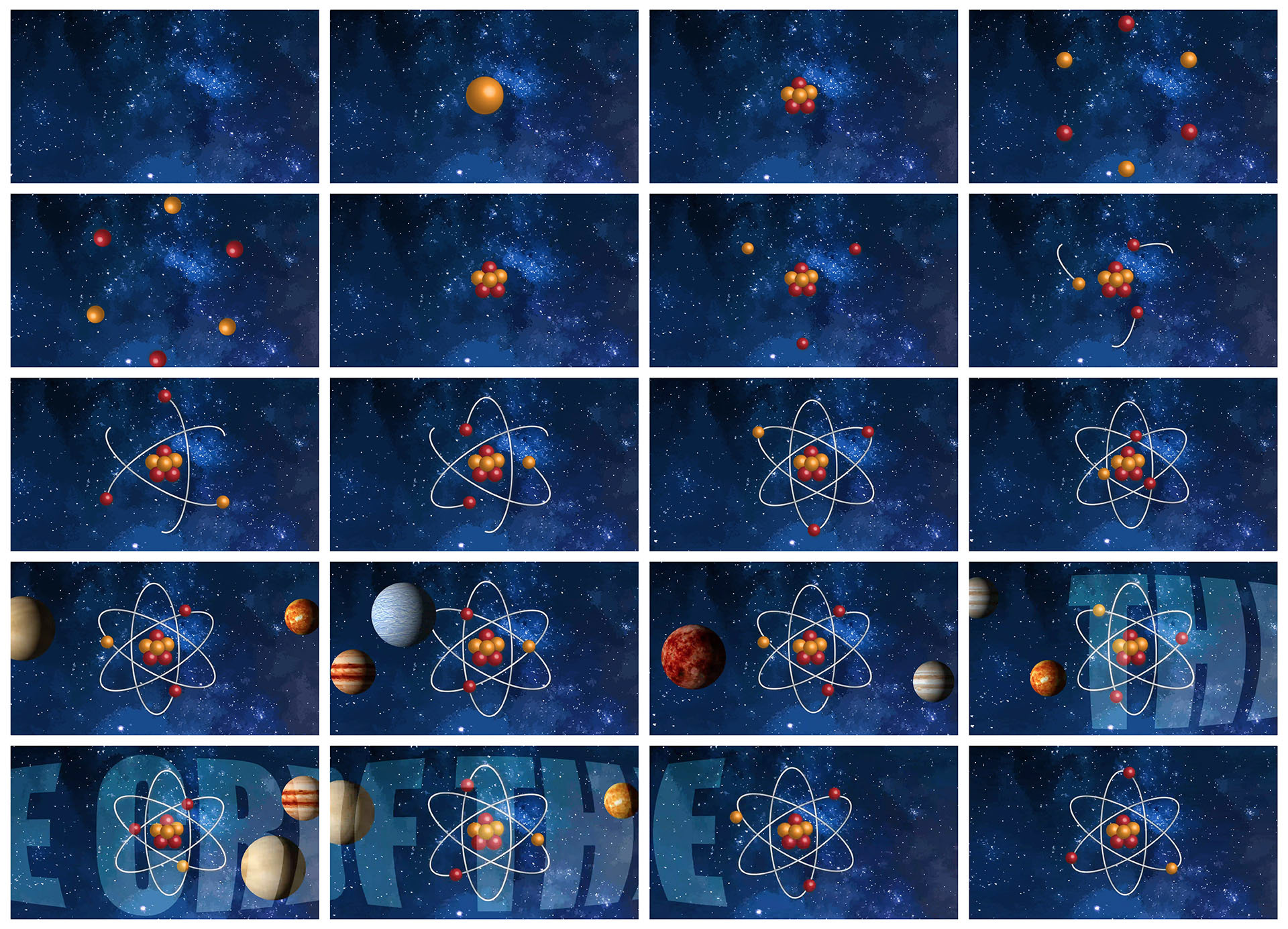 The Creation of the Universe animation is a ludic and non-scientifically accurate motion graphics, that shows an atom being born from nothing and evolving into a complete solar system with planets and stars.